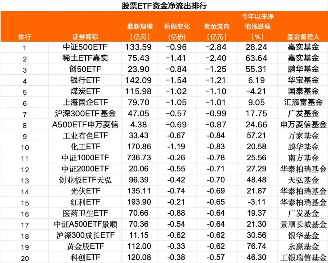 在净流出前20大股票ETF中,除了中证500和创50等宽基ETF,稀土、银行、煤炭、国企等行业主题ETF净流出金额较多。
