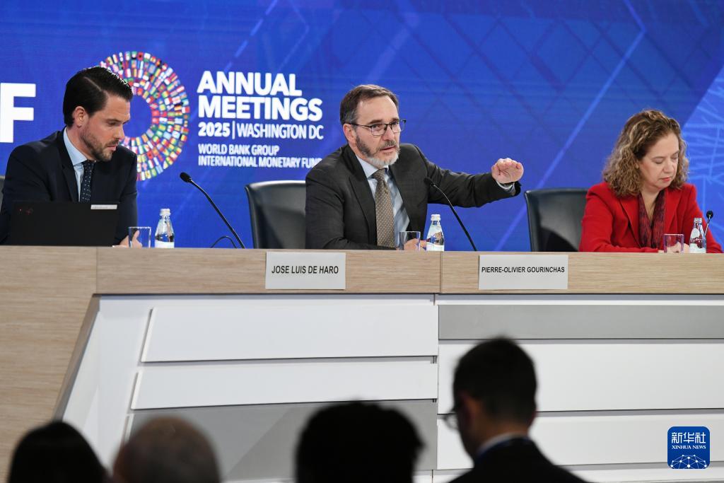 10月14日,在美国华盛顿,国际货币基金组织首席经济学家皮埃尔-奥利维耶·古兰沙(左)在《世界经济展望报告》新闻发布会上展示报告。李睿 摄