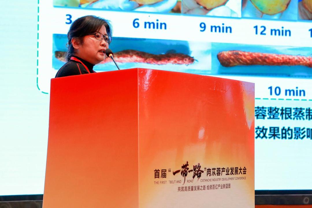 此外,多位专家和企业代表也进行了专业研究和行业实践报告。中国医学科学院药用植物研究所研究员黄林芳深入剖析了《“沙漠人参”肉苁蓉的品质生态研究》,揭示了肉苁蓉品质形成的生态机制。兰州大学教授胡芳弟介绍了《药食同源中药鲜贮技术及应用》,为肉苁蓉的保鲜加工提供了全新的思路与技术方案。天津中医药大学教授窦志英详细阐述了《肉苁蓉趁鲜加工和炮制工艺的研究和思考》,有力推动了产业技术的标准化与规范化进程,助力提升产品质量与市场竞争力。北京中医药大学教授李卫东带来《肉苁蓉资源现状及开发利用展望》的分享,详细剖析了当下肉苁蓉资源的分布、储量及生长环境等现状并对其作出展望。内蒙古大学曹瑞教授则以《保护梭梭沙漠绿洲,促进沙产业可持续发展——我国梭梭和肉苁蓉资源》为主题,详细阐述了保护梭梭沙漠绿洲对于维护生态平衡、促进沙产业可持续发展的重要意义。