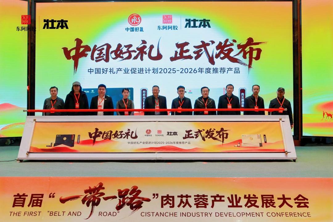 会议最后,“中国好礼”发布仪式举行。东阿阿胶壮本品牌肉苁蓉原浆和阿胶肉苁蓉原浆凭借卓越品质、独特工艺和良好口碑,成功入选“中国好礼产业促进计划2025-2026年度推荐产品”。这一荣誉既是对公司产品品质的高度认可,也是对其推动肉苁蓉产业高质量发展和打造中国特色健康礼品努力的肯定。