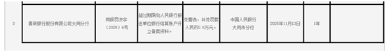 中国人民银行大同市分行近日公布的行政处罚决定信息公示表(同银罚决字〔2025〕6号)显示,晋商银行股份有限公司大同分行超过期限向人民银行报送单位银行结算账户开立备案资料。