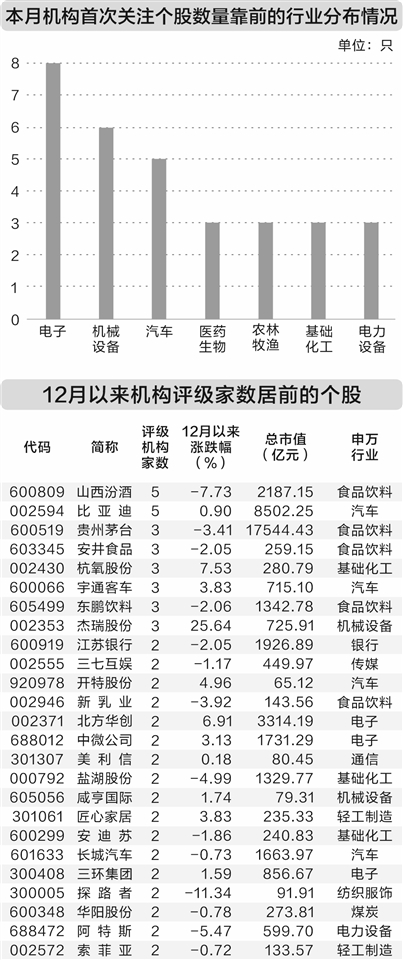 从个股来看,本月以来共有8股获得3家及以上机构评级,其中比亚迪、山西汾酒机构评级家数居前,各有5家,贵州茅台、安井食品、杭氧股份等6股机构评级家数为3家。