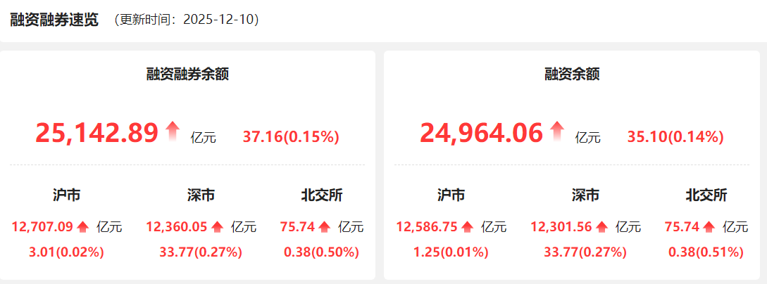 12月10日,A股两融余额为25142.89亿元,较上一交易日增加37.16亿元,占A股流通市值比例为2.60%。当日两融交易额为1812.93亿元,较上一交易日减少218.27亿元,占A股成交额的10.11%。