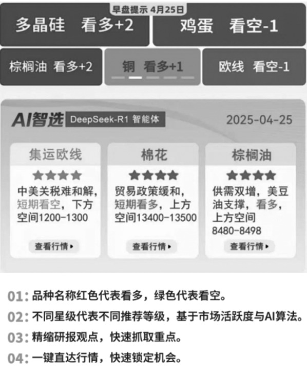 面向终端客户服务,大模型应用实现从“被动响应”到“主动赋能”的转变。另一家期货公司与同花顺联合开发的“AI智选”栏目,基于DeepSeek-R1大模型深度调校,每日研读海量研报后甄选三个具备中长期价值的期货品种,通过五星评级体系和“红绿灯”多空标识直观呈现机会。为保障合规性,大模型筛选结果需经持牌研究员二次复核,既破解了普通投资者信息超载的痛点,又守住了金融服务的专业底线。