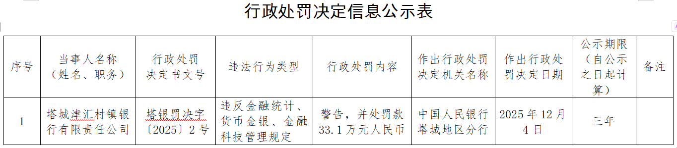 中国人民银行新疆维吾尔自治区分行网站12日发布中国人民银行塔城地区分行行政处罚决定信息公示表(塔银罚决字〔2025〕2号)。塔城津汇村镇银行有限责任公司违反金融统计、货币金银、金融科技管理规定。中国人民银行塔城地区分行决定对其处以警告,并处罚款33.1万元人民币。