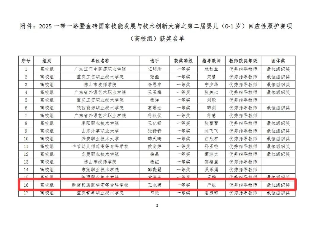 近日,2025“一带一路”暨金砖国家技能发展与技术创新大赛第二届婴儿(0-1岁)回应性照护赛项(高校组)全国总决赛在重庆落下帷幕。黔南民族医学高等专科学校(以下简称“黔南医专”)学子在比赛中表现优异,斩获一等奖、三等奖及多个团体、个人奖项,展现了扎实的专业技能和良好的精神风貌。