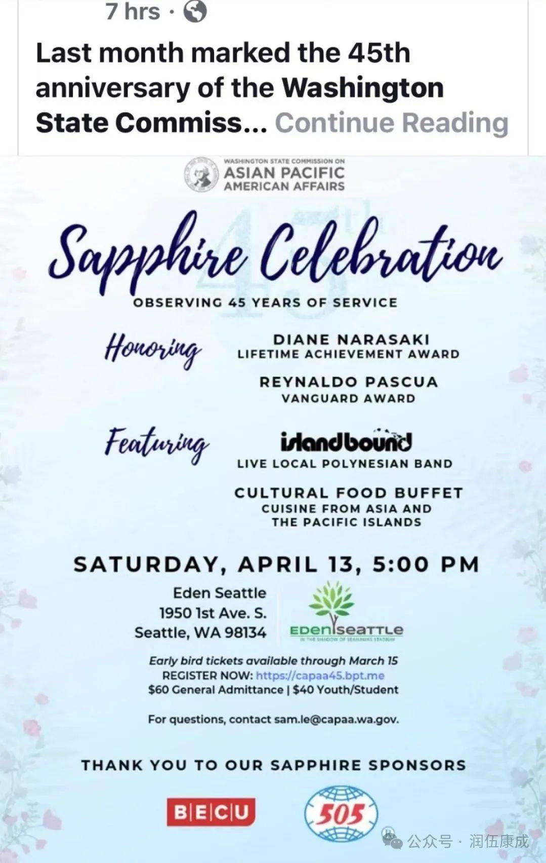 首先,我谨代表中美加友好协会、505集团公司董事局感谢亚太裔事务办公室的邀请,参加今天的蓝宝石庆典活动。祝贺亚太裔事务45周年庆典活动成功举办!讚揚長谷川女士為社區做出的貢獻,也感謝Tony Au為社區服務的熱情和努力!