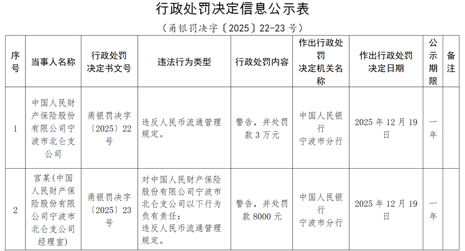 公告显示,中国人民财产保险股份有限公司宁波市北仑支公司违反人民币流通管理规定,中国人民银行宁波市分行对其处以警告,并处罚款3万元。宫某(中国人民财产保险股份有限公司宁波市北仑支公司经理室)对上述行为负有责任,被处警告,并处罚款8000元。
