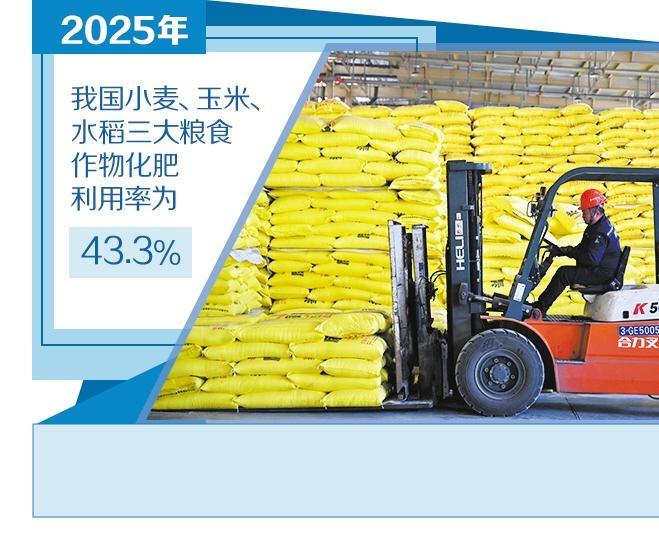 化肥是作物的“粮食”。农业农村部最新发布数据显示,经田间试验、测算分析和专家论证,2025年我国小麦、玉米、水稻三大粮食作物化肥利用率为43.3%,比2020年提高3.1个百分点。