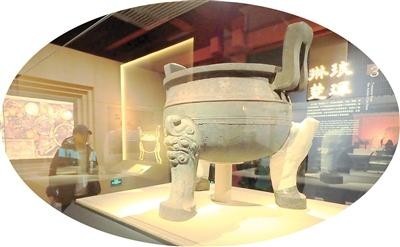 独立展柜里陈列着一件馈鼎,为铜身铁足,腹部篆刻18字铭文,其中,“左使车”是战国时期中山国的官办手工业机构,“车”作“库”解,是中山国特有的名称;“重四百五十八刀”为中山国的量制重量。中山国之物出现在楚王墓中,是战国晚期文化交融的缩影。