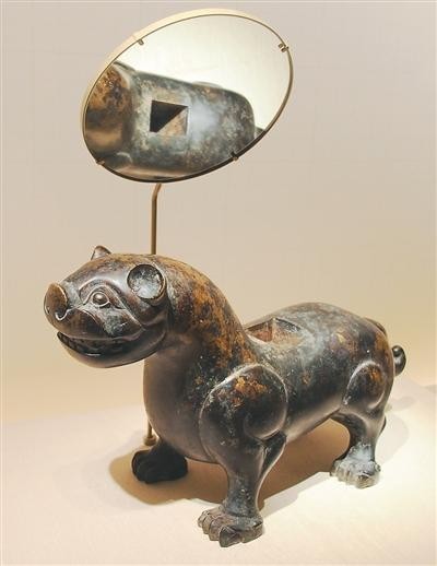 展柜里,两只相向而立、造型可爱的青铜虎引人注目。它们是做什么用的?由展板上的介绍可知,这是一套两件虎形青铜钟虡,虎背上有长方形卯孔,用于承载编钟架两侧的柱子。透过小圆镜可以看到虎座颈部刻有“外乐”等文字,尾部亦有铭文,记载了铸造时间、重量等信息。武王墩一号墓出土了两套虎形钟虡,分别对应两套编钟。另一套钟虡为漆木质地,刻有“内乐”铭文。专家认为“外乐”“内乐”可能是宫城或居所内外所奏各类音乐的统称。