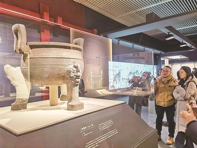 在现场,一件缠着“绷带”的青铜镬鼎吸引众多目光。这件青铜镬鼎的两只“脚”都被缠上了绷带。难道是“骨折”了?带着好奇凑近展牌,原来是因为鼎足已破损开裂严重,为防止病害进一步发展,考古人员用高分子绷带对鼎足进行临时加固。这是一种成熟的考古现场文物应急保护技术,可以在短时间内为脆弱部位提供支撑,有效防止提取和搬运过程中的二次损伤,同时固化后的材料便于去除,完全符合文物保护所要求的可逆性和最小干预原则。