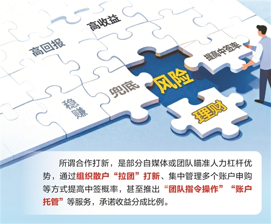 所谓合作打新,是部分自媒体或团队瞄准人力杠杆优势,通过组织散户“拉团”打新、集中管理多个账户申购等方式提高中签概率,甚至推出“团队指令操作”“账户托管”等服务,承诺收益分成比例,其中不乏“团队拿五成、客户拿五成”的合作模式。