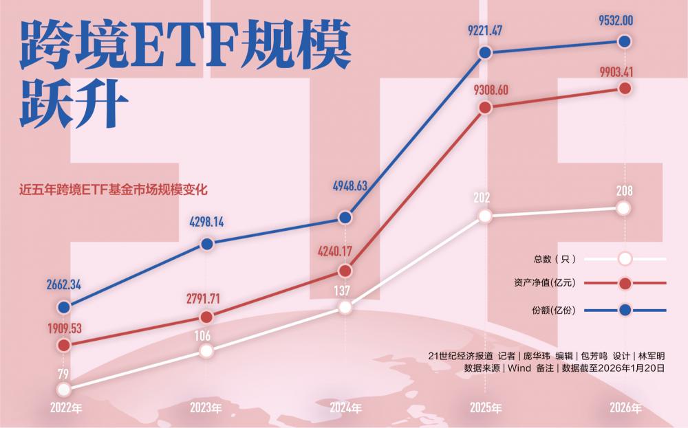 尽管随后市场波动使这一数字略有回调,但截至2026年1月20日(下同),全市场跨境ETF规模仍高达9903.82亿元。
