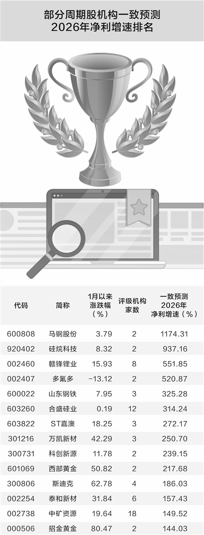 据数据宝统计,机构一致预测显示,在有色、化工、石油石化、钢铁等周期板块中,获两家及以上机构评级、 且2025年净利润预测为正的个股中,有20只2026年净利润有望大幅增长超100%。