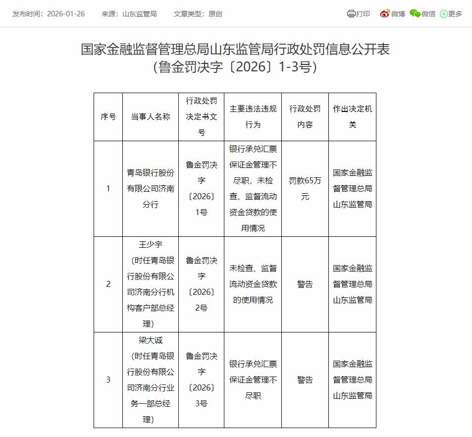 国家金融监督管理总局网站昨日发布的山东监管局行政处罚信息公开表(鲁金罚决字〔2026〕1号)显示,青岛银行股份有限公司济南分行存在以下主要违法违规行为:银行承兑汇票保证金管理不尽职,未检查、监督流动资金贷款的使用情况。国家金融监督管理总局山东监管局对青岛银行股份有限公司济南分行罚款65万元。