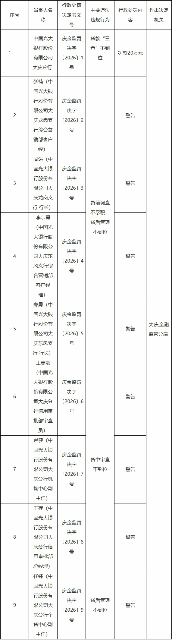 国家金融监督管理总局网站1月29日公布的大庆监管分局行政处罚信息公开表(庆金监罚决字〔2026〕1、2、3、4、5、6、7、8、9号)显示,中国光大银行股份有限公司大庆分行贷款“三查”不到位。