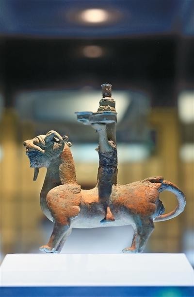 三国时期人骑兽形铜灯盏造型别致,虎头狮身的神兽身上骑着一个人,人像深目高鼻,长脸垂耳,神态严肃,头顶插一圆管形帽,上身裸露,下穿长衭,双手平举,一手托盏。神兽肌肉饱满,昂首张口,双目圆瞪,下颌长须,四腿直立。此灯的人像似胡人,也有学者认为这是道教方士或巫师形象。