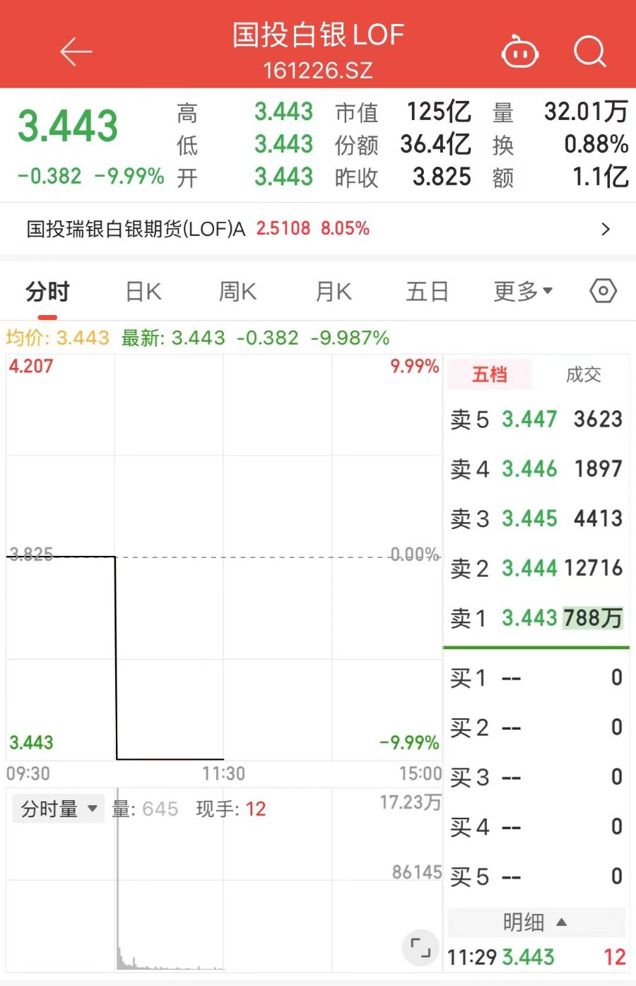 2月5日,国投白银LOF开盘后再度封于跌停板,报3.443元。这已是该基金自2月2日复牌以来,连续第四个交易日开盘即跌停。截至午盘,跌停板上的封单仍超过700万手。与此同时,其二级市场价格相较基金净值的溢价率已收窄至37.13%。