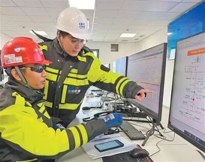 在乌兹别克斯坦塔什干光储项目储能站主控制室内,中方工程师正指导外籍员工检查线路侧运行数据。 陈 鹤摄