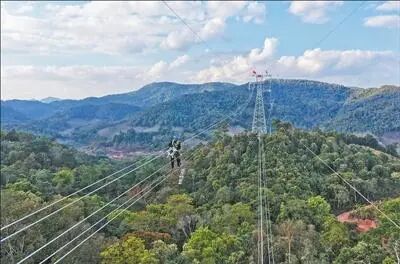 老挝磨丁,炽烈的阳光将铁塔银线照得闪闪发光。中老国境线两侧的铁塔上分别悬挂着中国和老挝国旗,两国电力工作者正在紧张忙碌着。2月5日,中老500千伏联网工程中国段与老挝段线路全线贯通,标志着中老能源合作迈入新阶段。“牵手”成功后,双方建设者持续努力,为4月实现中老两国段同步投运全力冲刺。