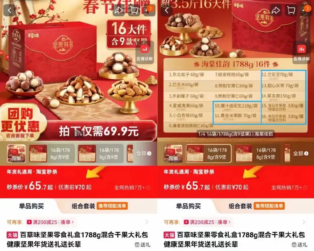 百草味官方旗舰店款标重1788克的坚果零食礼盒,其商品首页展示图片上均为坚果,但该礼盒实则有1248克、近70%的重量来自坚果植物蛋白饮料、果冻爽和灰枣等非坚果产品。