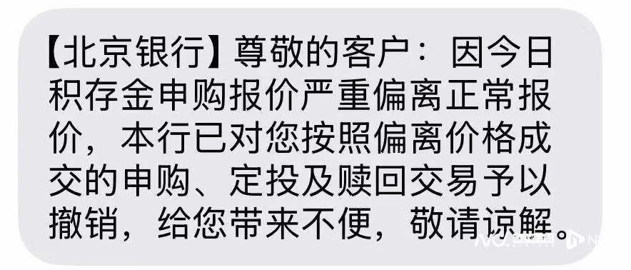 不过,多名投资者反映,其账户内此前因异常交易产生的资金被银行划扣。还有投资者表示,此前购买积存金的资金,已以“冲正”方式退回至其个人储蓄账户。部分投资者收到北京银行短信通知称,因今日积存金申购报价严重偏离正常报价,北京银行已对客户按照偏离价格成交的申购、定投及赎回交易予以撤销。