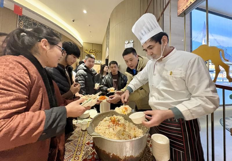 “手抓饭开锅咧!”随着一声声吆喝,盛满香喷喷手抓饭的大锅前很快围满了人,市民游客驻足品尝。这锅饭用上等大米配以羊肉、胡萝卜、专用调料蒸制而成,米粒晶莹、肉香四溢,令人赞不绝口。