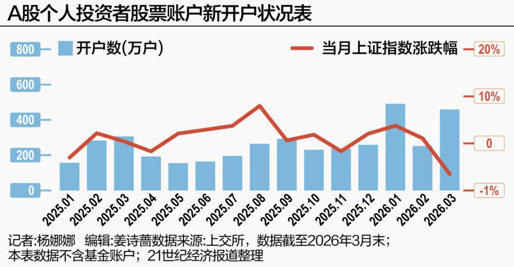 据上交所统计,3月A股新增投资者开户数达460.14万户(其中个人投资者458.82万户),环比增长82.38%,同比增长50.1%。至此,2026年一季度沪市A股新开户累计突破1204万户,同比增长超六成,相当于平均每天超13万户投资者入市。