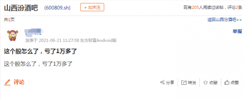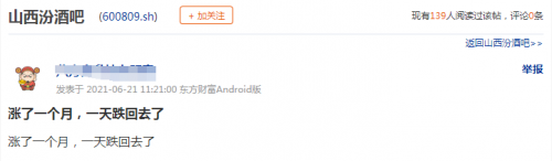 不过,今日大幅下跌对高位杀入的投资者却不那么友好,山西汾酒股吧热度迅速上升,网友也纷纷开展留言。有网友表示,“这个股怎么了,亏了1万多了”,“我一买就跌,累”,也有投资者留言称,“涨了一个月,一天跌回去了”。
