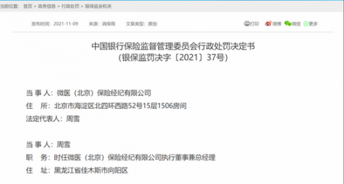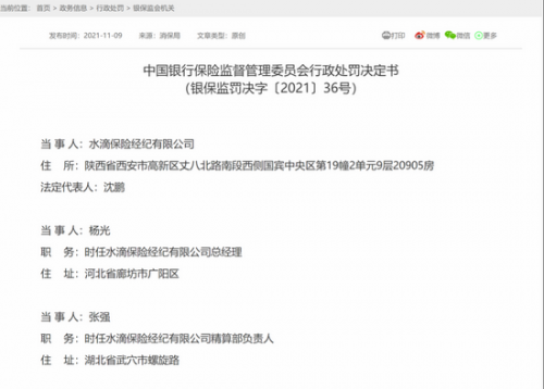 11月9日,中国银保监会消保局公布了对上述两家公司的行政处罚决定书。其中,水滴经纪被罚人民币100万元,该公司相关责任人杨光和张强分别被处以10万元罚款并予以警告;微医经纪被罚人民币10万元,相关责任人周雪被罚款1万元,并予以警告。