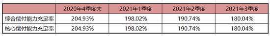 此外,与消费者息息相关的偿付能力方面,复星保德信人寿步入2021年持续下滑。综合偿付能力充足率和核心偿付能力充足率从2020年4季度末的204.93%,一路下滑至2021年1季度的198.02%、2季度的190.74%,最后到3季度的180.04%。
