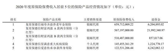 对此,《险企高参》发现复星保德信人寿2020年度报告发现,其2020度保费前五的保险产品中,有4个保险产品主要销售渠道都是银邮代理,实现原保险保费收入合计18.6亿元,占当年保费的71.93%。其中排名第二和第三的均为分红型产品。