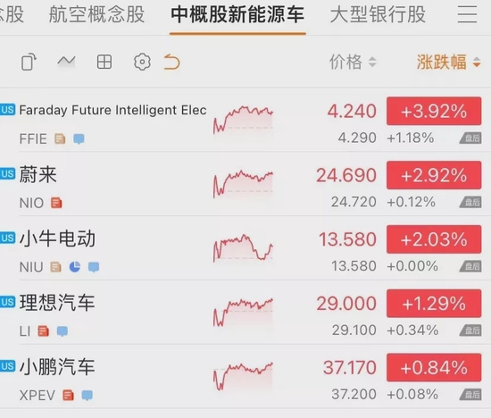 新能源车“蔚小理”也集体收涨。蔚来汽车涨近3%,理想汽车涨超1%,小鹏汽车涨超0.8%。