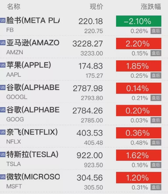 龙头科技股几乎全线上涨,亚马逊收涨2.2%,苹果涨超1.8%,微软涨1.2%,奈飞涨近0.4%,谷歌母公司Alphabet涨超0.1%,特斯拉收涨逾1.6%。