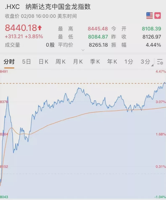 追踪中概股的纳斯达克中国金龙指数也应声上涨了近4%。