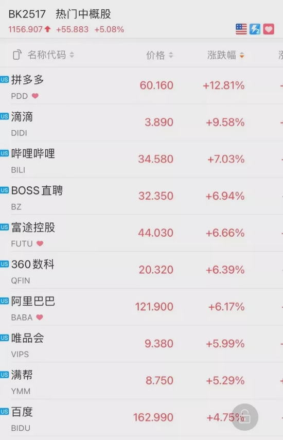 拼多多涨近13%领跑纳斯达克100指数,中概电商“三巨头”阿里、京东、拼多多一夜共计飙涨近400亿美元(约2500亿人民币)。另外,哔哩哔哩涨超7%,唯品会涨近6%,百度、网易、斗鱼、爱奇艺、微博均涨超4%。