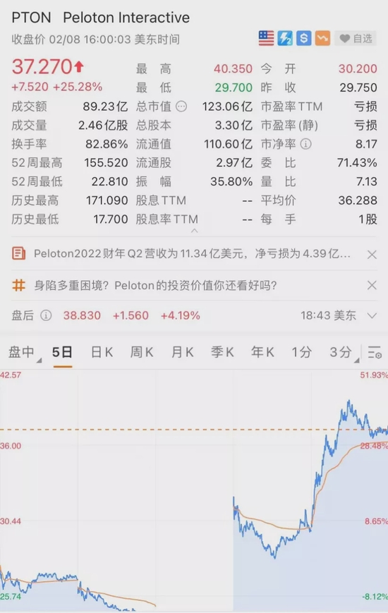 互动健身平台Peloton继续2月8日暴涨之势,尽管今日公布的财报不佳,但仍暴涨超25%,两日累计涨近50%。