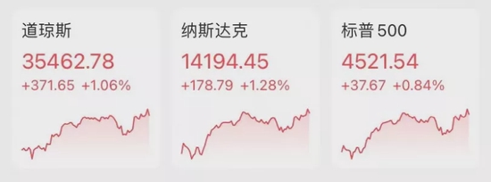 最终,三大指数自2月2日上周三以来最近四个交易日首度集体收涨,处于最近四日最高收盘水平。道指收涨371.65点,涨幅1.06%,报35462.78点。标普500收涨0.84%,报4521.54点;纳指收涨1.28%,报14194.46点,均抹平周一跌幅。