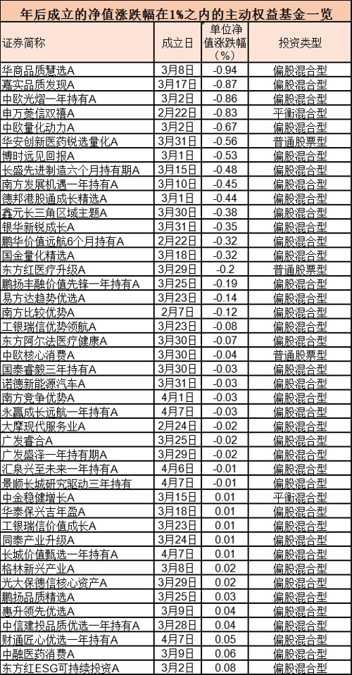 比如,王健管理的中欧光熠一年持有A成立于今年3月2日,截至4月13日,累计净值跌幅为0.86%;袁航管理的鹏华价值远航6个月持有A于2月22日成立,至今累计净值跌幅为0.32%;邱延冰管理的中金稳健增长A成立于3月15日,至今累计净值涨幅仅为0.01%。此外,骆帅管理的南方发展机遇一年持有A、沙炜管理的博时远见回报A、林英睿管理的广发睿合A等自成立以来净值波动都不大。