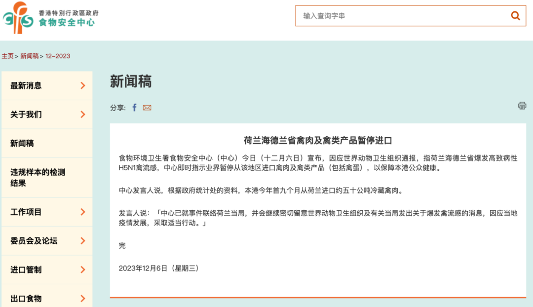 12月6日,中国香港食物环境卫生署食物安全中心宣布,因应世界动物卫生组织通报,指荷兰海德兰省暴发高致病性H5N1禽流感,中心即时指示业界暂停从该地区进口禽肉及禽类产品(包括禽蛋),以保障香港公众健康。