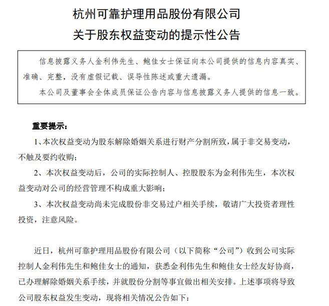 可靠股份2月28日晚间公告,经友好协商,实际控制人金利伟和鲍佳已办理解除婚姻关系手续,并就股份分割等事宜做出相关安排。