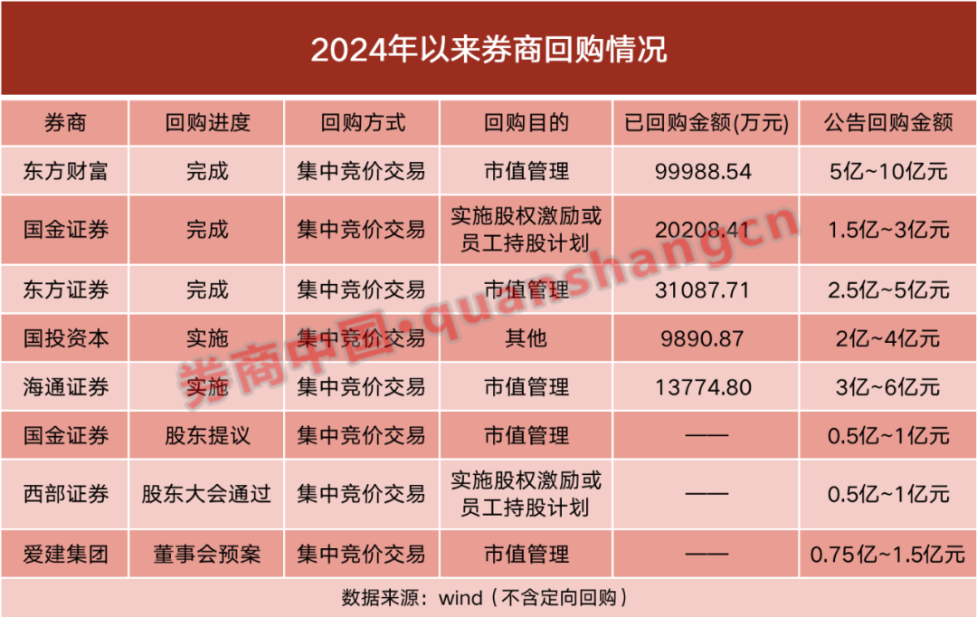 2024年以来,A股上市公司主动运用回购工具维护公司价值的意愿不断增强,券商板块已有近10家公司披露了回购进展,以“真金白银”向市场传递积极信号。