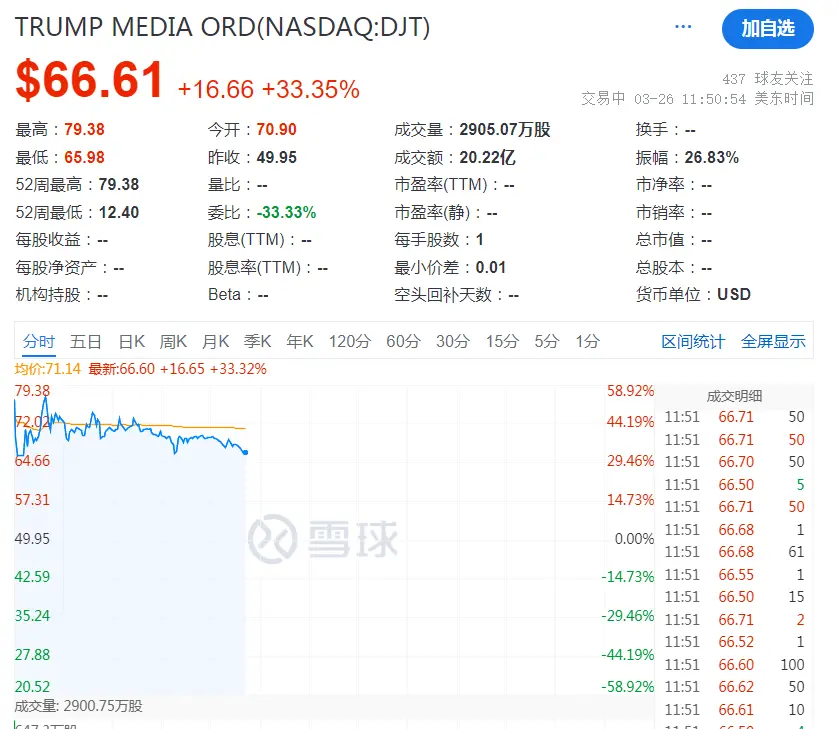 美国前总统、共和党总统选人特朗普的公司“特朗普媒体科技集团( Trump Media & Technology Group)”,正式在纳斯达克挂牌交易,代码为DJT,上市后一度上涨50%以上,触及波动性限制而暂停交易了几分钟。