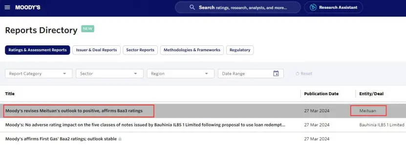 国际知名评级机构穆迪27日发布报告,将中国互联网公司美团的信用展望从“稳定”上调至“正面”,并重申其Baa3的发行人评级及优先无担保票据评级。