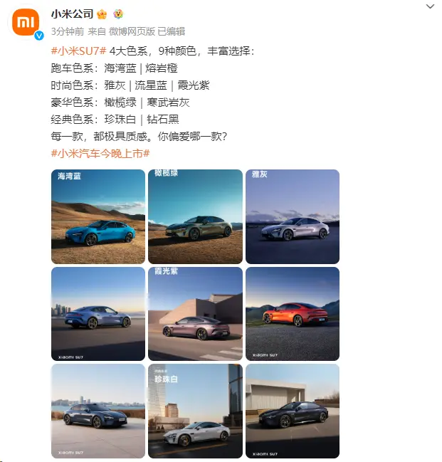 此前,小米汽车有海湾蓝、橄榄绿和雅灰三款颜色。雷军表示:“前几天小米汽车销售门店开业,很多人看完跟我说,真车比照片好看很多,主要是我们型面非常圆润,无论怎么拍照都很难拍出那种感觉。”在本次发布会上,小米汽车又推出了流星蓝、霞光紫、寒武岩灰、熔岩橙、珍珠白、钻石黑六大颜色。