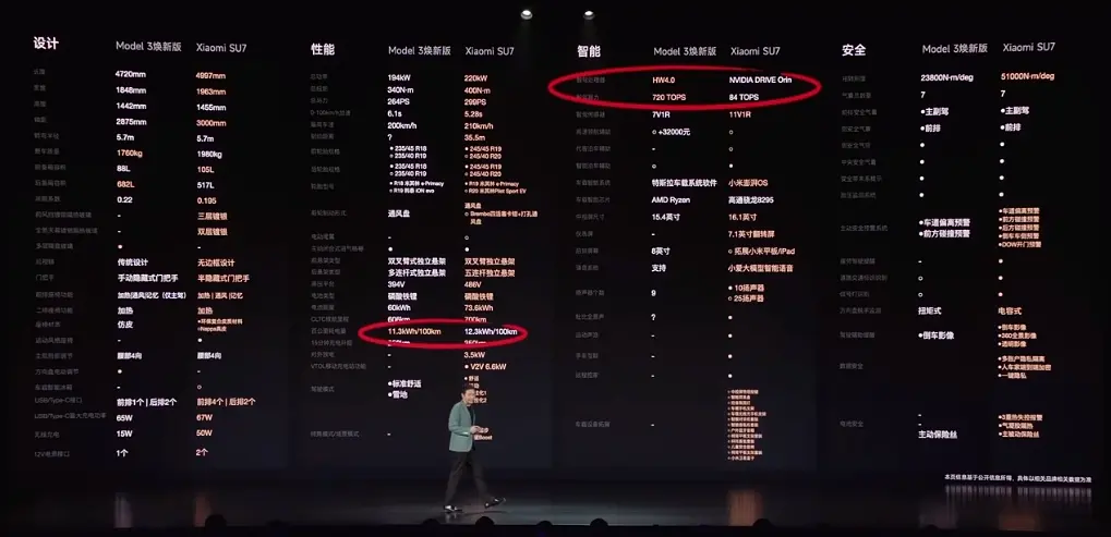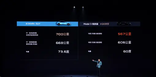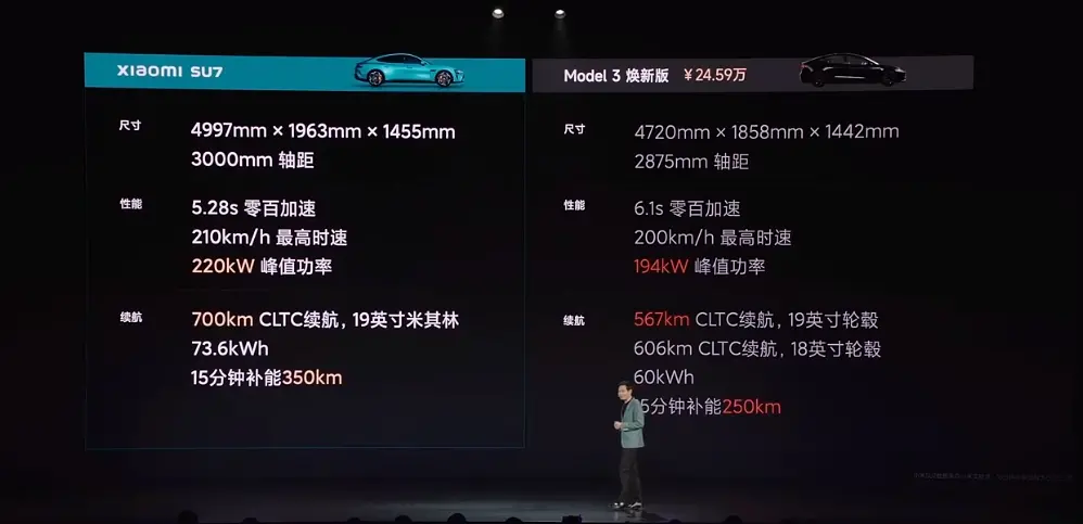 谈到价格,雷军表示,“不谈配置谈定价就是耍流氓”。从各种指标来看,小米SU7基本不输特斯拉Model 3,因此在定价上也对标特斯拉Model 3,比其便宜3万元作为致敬。