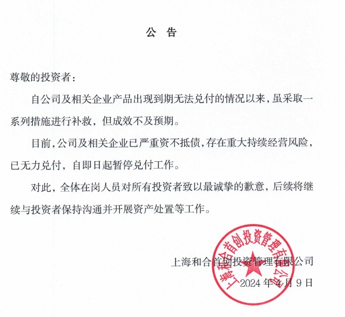 和合首创在相关公告中称,自公司及相关企业产品出现到期无法兑付的情况以来,虽采取一系列措施进行补救,但成效不及预期。目前公司及相关企业已严重资不抵债,存在重大持续经营风险已无力兑付,自即日起暂停兑付工作,后续将继续与投资者保持沟通并开展资产处置等工作。