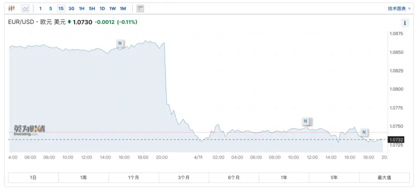 当地时间4月10日,受美国3月CPI全面超预期影响,欧元兑美元汇率大幅跳水,单日大跌超1%,年内累计跌幅已扩大至2.8%,最新报1.0741。