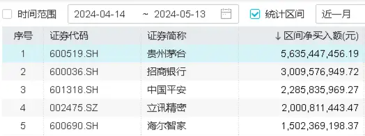 资金面上,北向资金持续加码贵州茅台。Wind数据显示,截至昨日(5月13日),近一个月,北向资金净买入贵州茅台高达56.35亿元,高居A股第1,是第二名招商银行的近两倍。